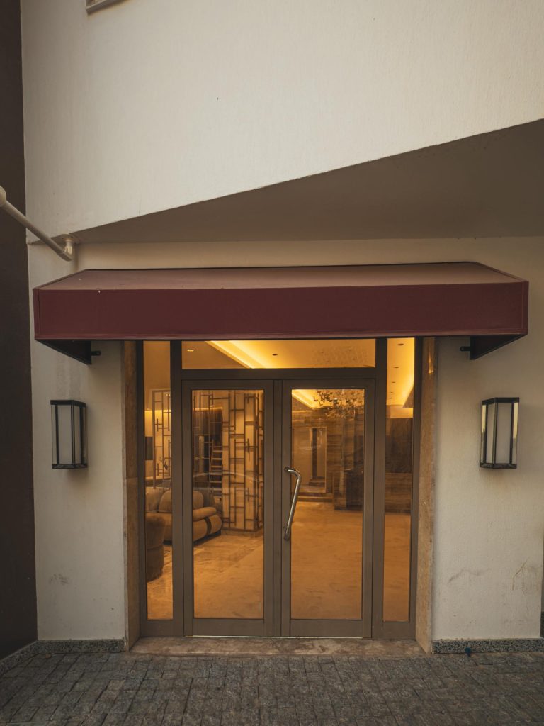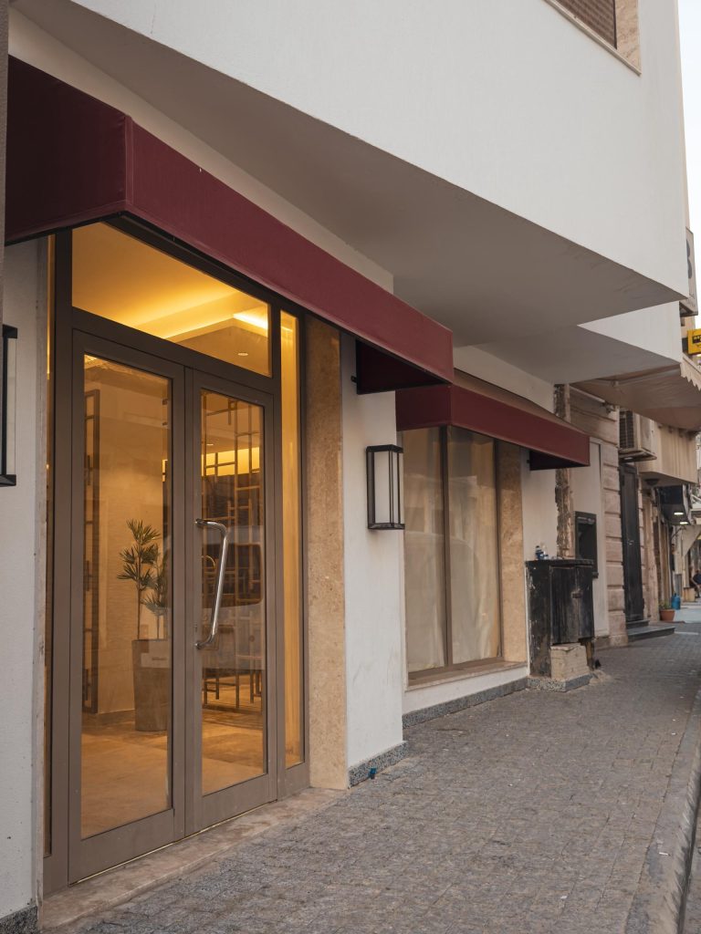 مدخل استقبال راقٍ مفتوح على الشارع مع جلسات ضیافة أنیقة.